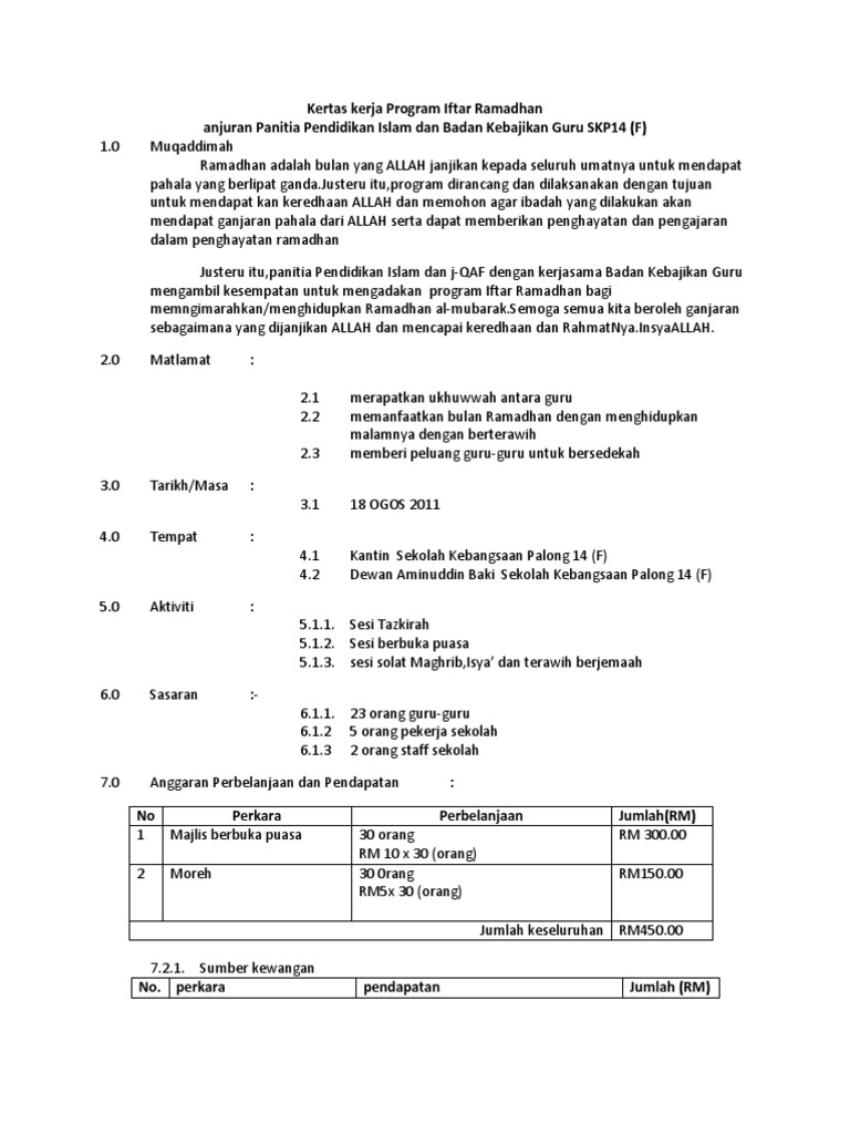 Kertas Kerja Iftar Ramadhan Pdf. Kertas kerja Program Iftar Ramadhan anjuran Panitia Pendidikan Islam dan Badan Kebajikan Guru SKP14 F Muqaddimah Ramadhan adalah bulan yang ALLAH janjikan kepada seluruh umatnya untuk mendapat pahala yang berlipat gandaJusteru ituprogram dirancang dan dilaksanakan dengan tujuan untuk mendapat kan keredhaan ALLAH dan memohon agar. Kertas Kerja Iftar Ramadhan - malayxexe - Ms kertas kerja hasn apos.